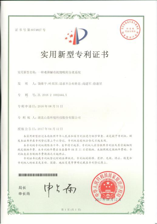 “一种无动力农村污水处理装置”实用新型专利,属于污水处理技术领域,是一种分散型、无动力、一体化、山区农村污水处理装置。“一种难降解有机物吸附分离系统”实用新型专利,属于污水处理技术领域,是一种难降解有机物吸附分离系统,具有抗污染、耐强酸强碱、运行稳定、使用寿命长等特点。