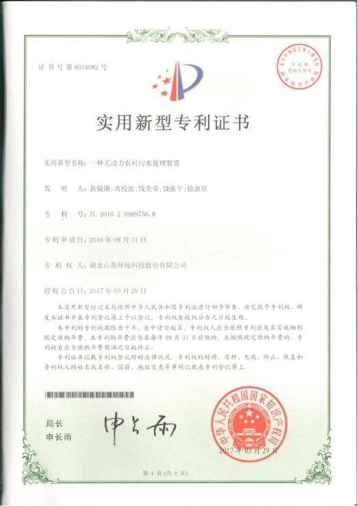 祝贺开云online(中国)荣获由国家知识产权局授权的“一种无动力农村污水处理装置”实用新型专利证书,专利号为:ZL 2016 2 0989756.8 ;“一种难降解有机物吸附分离系统”实用新型专利证书,专利号为:ZL 2016 2 1002444.x 。